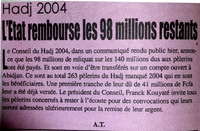 Hadj 2004 : l'État rembourse les 98 millions restants
