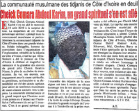 La communauté musulmane des tidjanis de Côte d'Ivoire en deuil : Cheick Comara Abdoul Karim, un grand spirituel s'en est allé