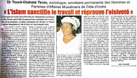 Dr Touré-Diabaté Tenin, sociologue, secrétaire permanente des Hommes et Femmes d'Affaires Musulmans de Côte d'Ivoire : "L'Islam sanctifie le travail et réprouve l'oisiveté"
