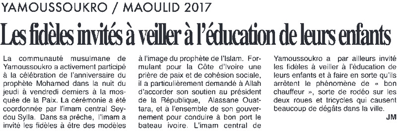 Yamoussoukro. Maoulid 2017 : les fidèles invités à veiller à l’éducation de leurs enfants