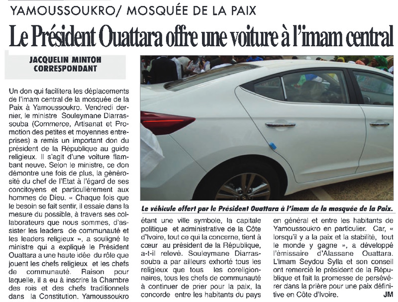 Yamoussoukro. Mosquée de la paix : le Président Ouattara offre une voiture à l’imam central