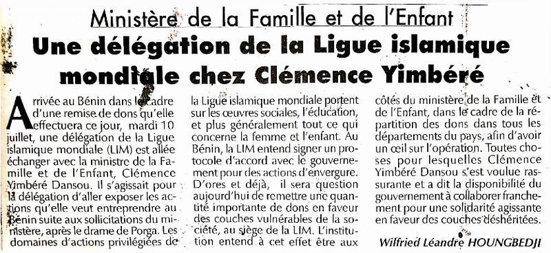 Ministère de la Famille et de l'Enfant : une délégation de la Ligue islamique mondiale chez Clémence Yimbéré
