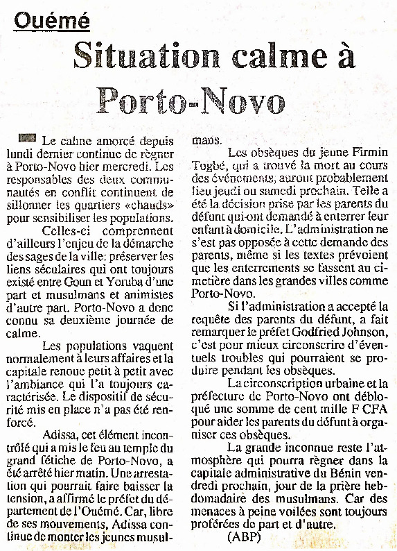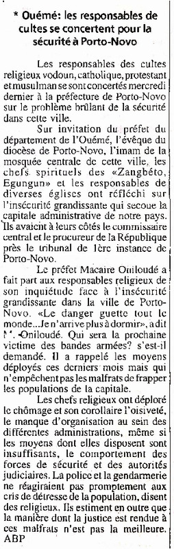 Ouémé : les responsables de cultes se concertent pour la sécurité à Porto-Novo