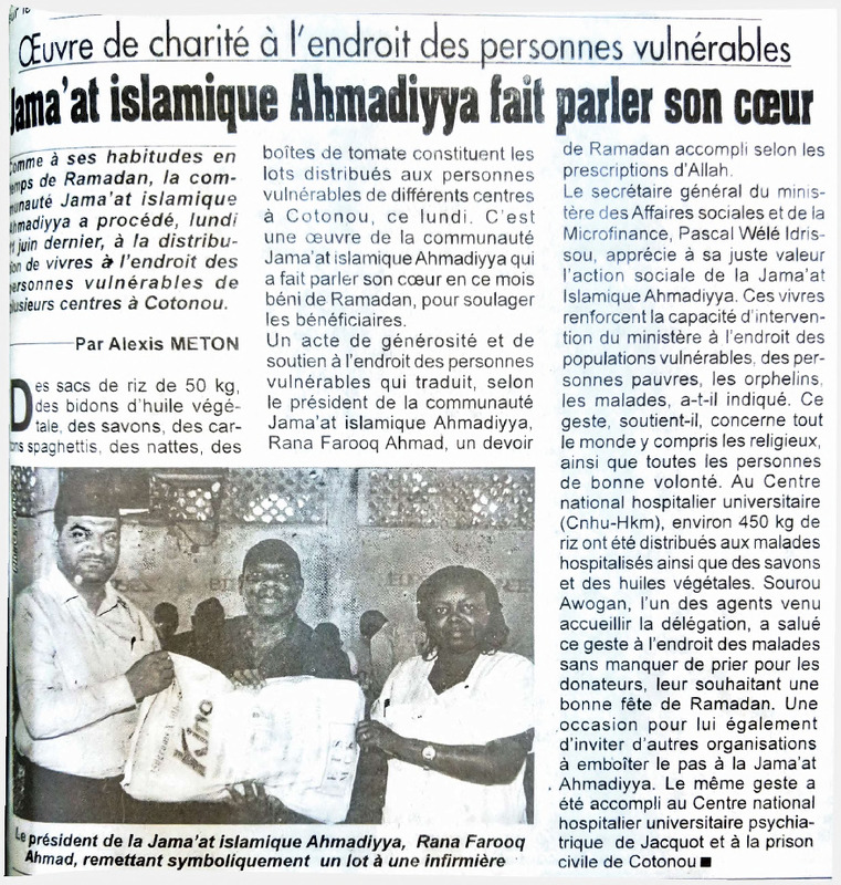 Œuvres caritatives de la Jama'at islamique Ahmadiyya Bénin : des démunis de l'Ouémé reçoivent des dons