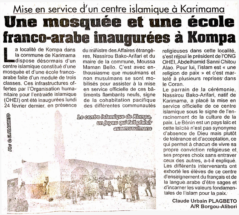 Mise en service d'un centre islamique à Karimama : une mosquée et une école franco-arabe inaugurées à Kompa