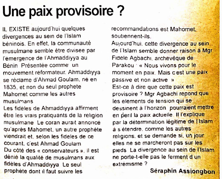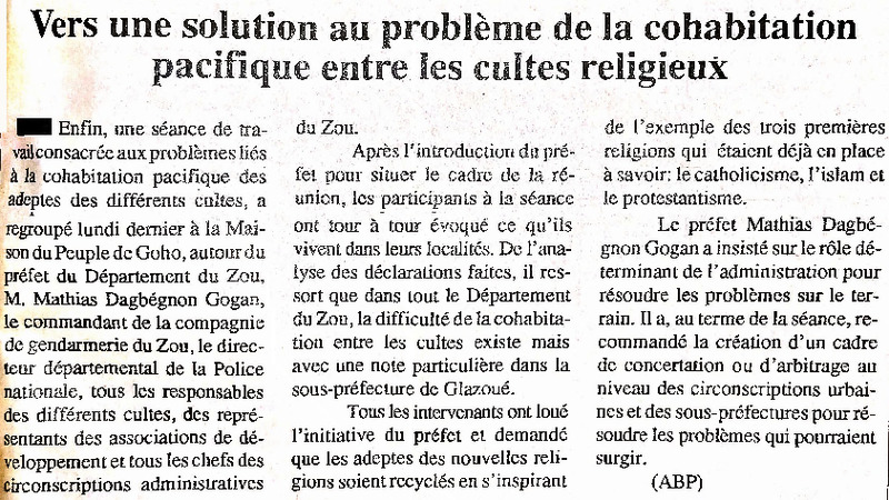 Vers une solution au problème de la cohabitation pacifique entre les cultes religieux