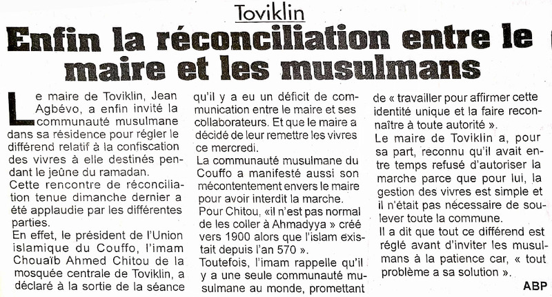 Toviklin : enfin la réconciliation entre le maire et les musulmans