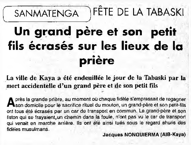 Sanmatenga. Fête de la Tabaski : un grand père et son petit fils écrasés sur les lieux de la prière