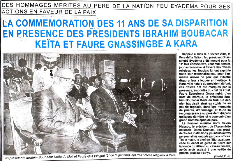 Des hommages mérités au père de la nation feu Eyadéma pour ses actions en faveur de la paix : la commémoration des 11 ans de sa disparition en présence des présidents Ibrahim Boubacar Kéïta et Faure Gnassingbé à Kara