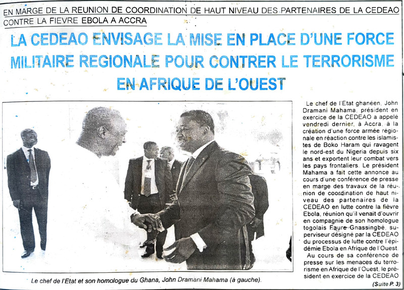 En marge de la réunion de coordination de haut niveau des partenaires de la CEDEAO contre la fièvre Ebola à Accra : la CEDEAO envisage la mise en place d'une force militaire régionale pour contrer le terrorisme en Afrique de l'Ouest