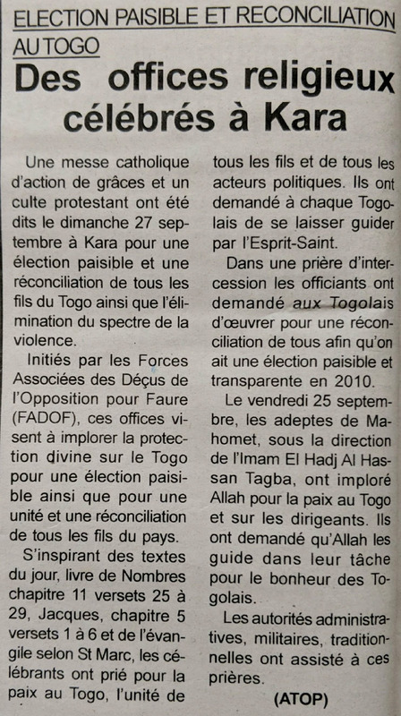 Élection paisible et réconciliation au Togo : des offices religieux célébrés à Kara