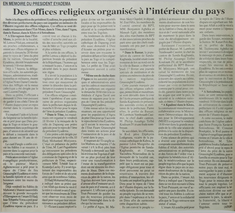 En mémoire de feu président Eyadéma : des offices religieux organisés à Blitta, Bassar dans l'Amou, le Haho, l'Avé et le Kpendjal