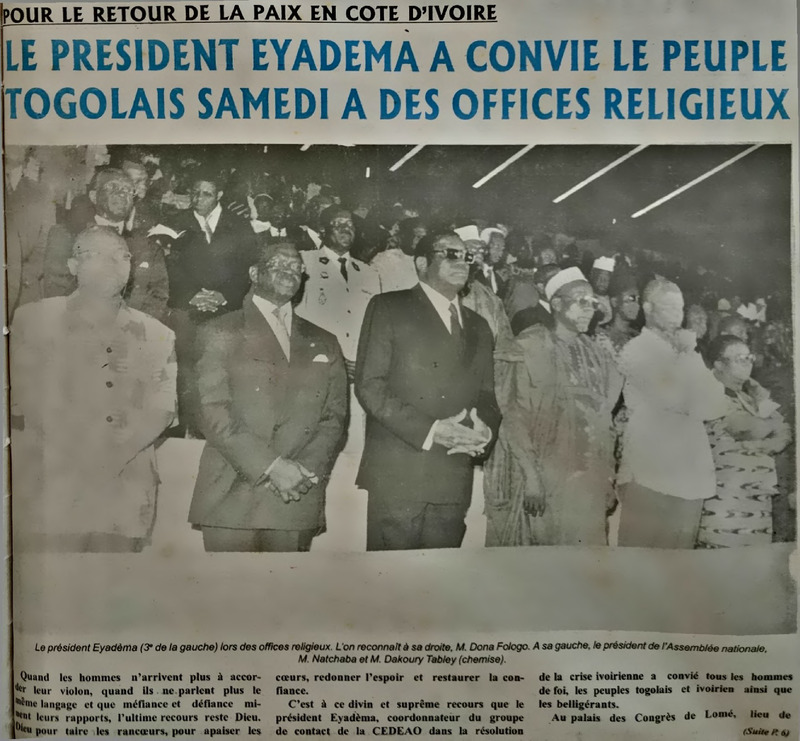 Pour le retour de la paix en Côte d'Ivoire : le président Eyadèma a convié le peuple togolais samedi à des offices religieux