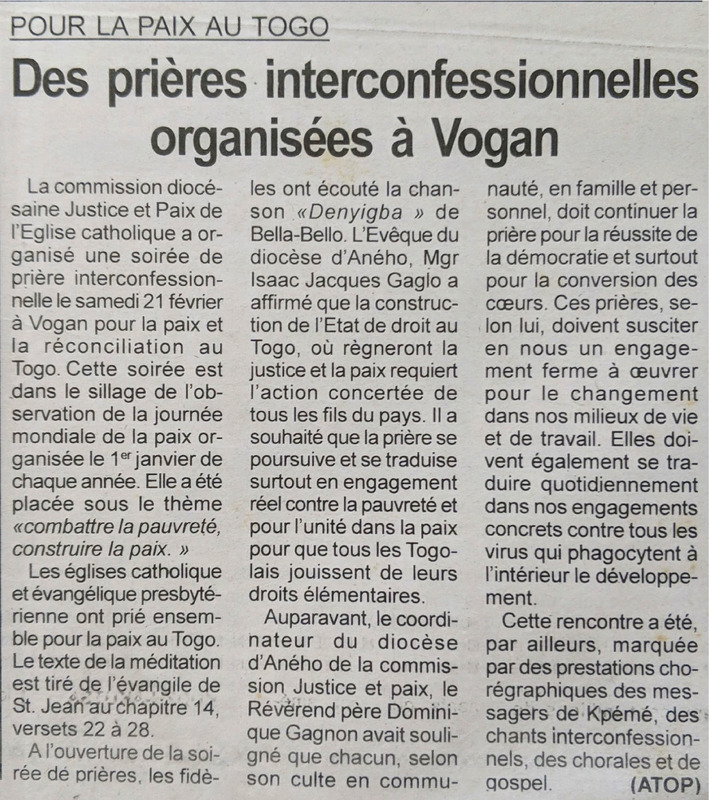 Pour la paix au Togo : des prières interconfessionnelles organisées à Vogan