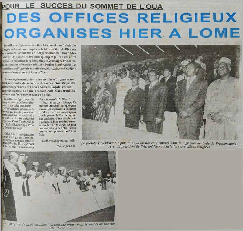 Pour le succès du sommet de l'OUA : des offices religieux organisés hier à Lomé