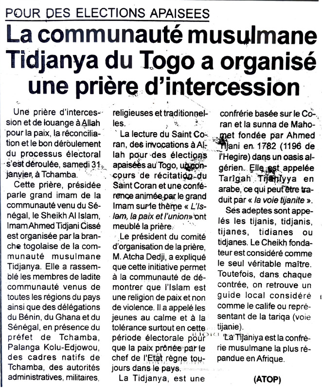 Pour des élections apaisées : la communauté musulmane Tidjanya du Togo a organisé une prière d'intercession