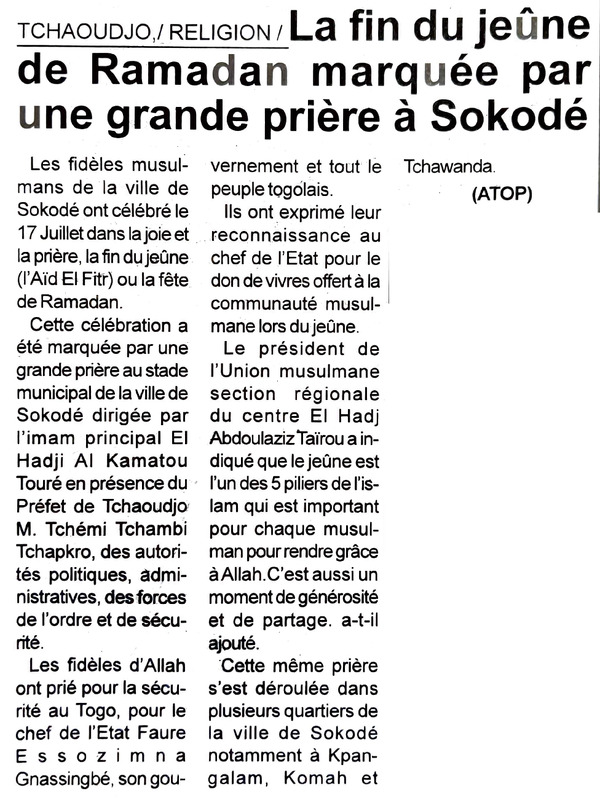 Tchaoudjo/religion : la fin du jeûne de Ramadan marquée par une grande prière à Sokodé