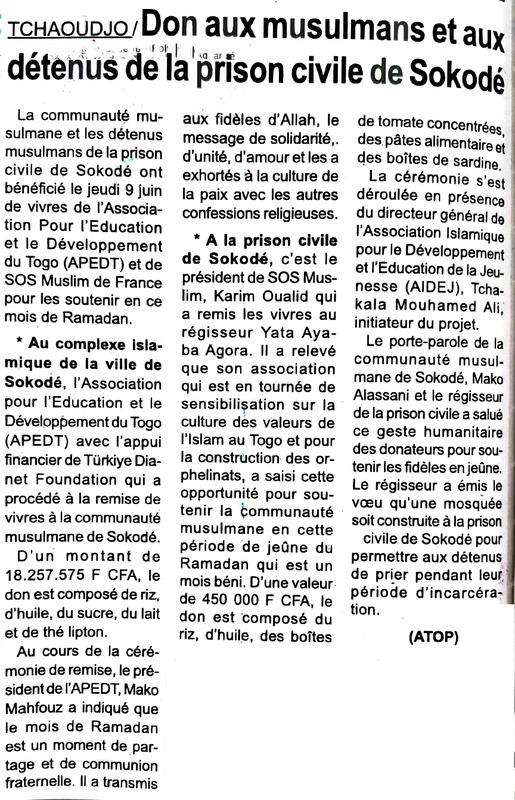 Tchaoudko : don aux musulmans et aux détenus de la prison civile de Sokodé
