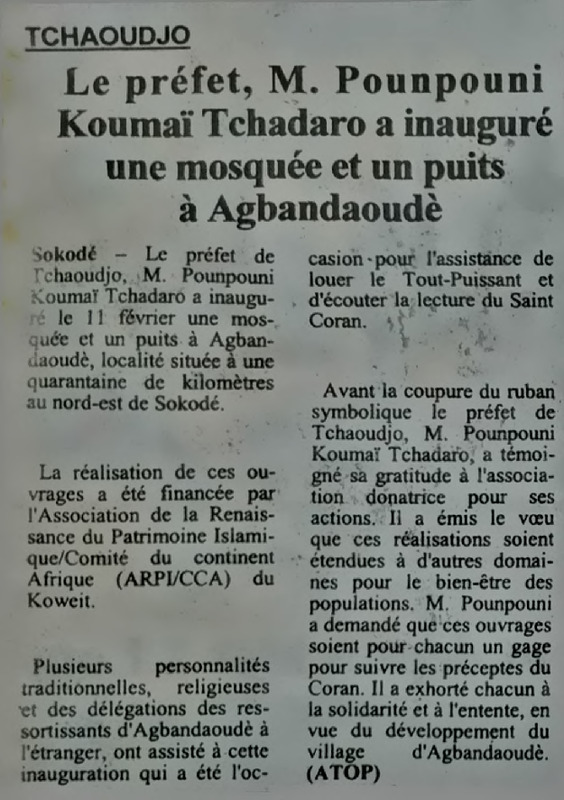 Tchaoudjo : le préfet, M. Pounpouni Koumaï Tchadaro a inauguré une mosquée et un puits à Agbandaoudè