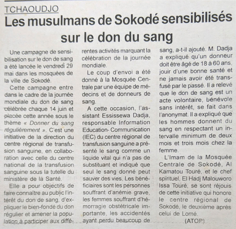 Tchaoudjo : les musulmans de Sokodé sensibilisés sur le don du sang