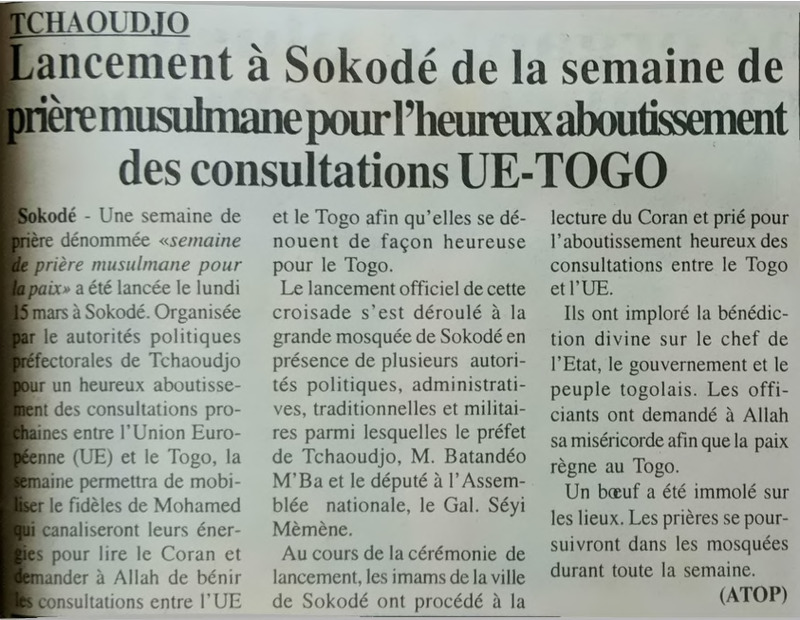 Tchaoudjo : lancement à Sokodé de la semaine de prière musulmane pour l'heureux aboutissement des consultations UE-TOGO