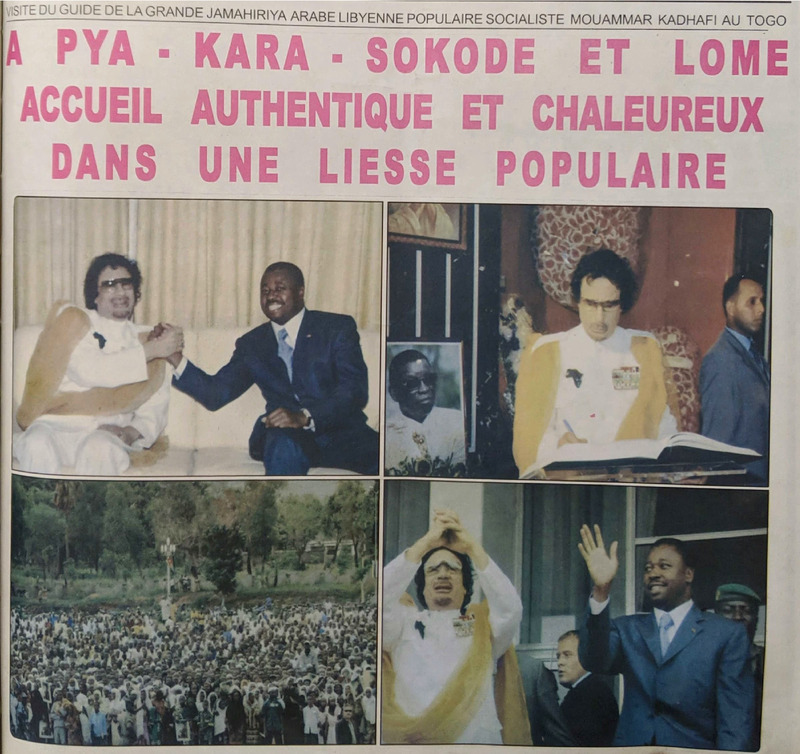 Visite du guide de la grande Jamahiriya Arabe Libyenne Populaire Socialiste Muammar Kadhafi au Togo. À Pya - Kara - Sokodé et Lomé : accueil authentique et chaleureux dans une liesse populaire