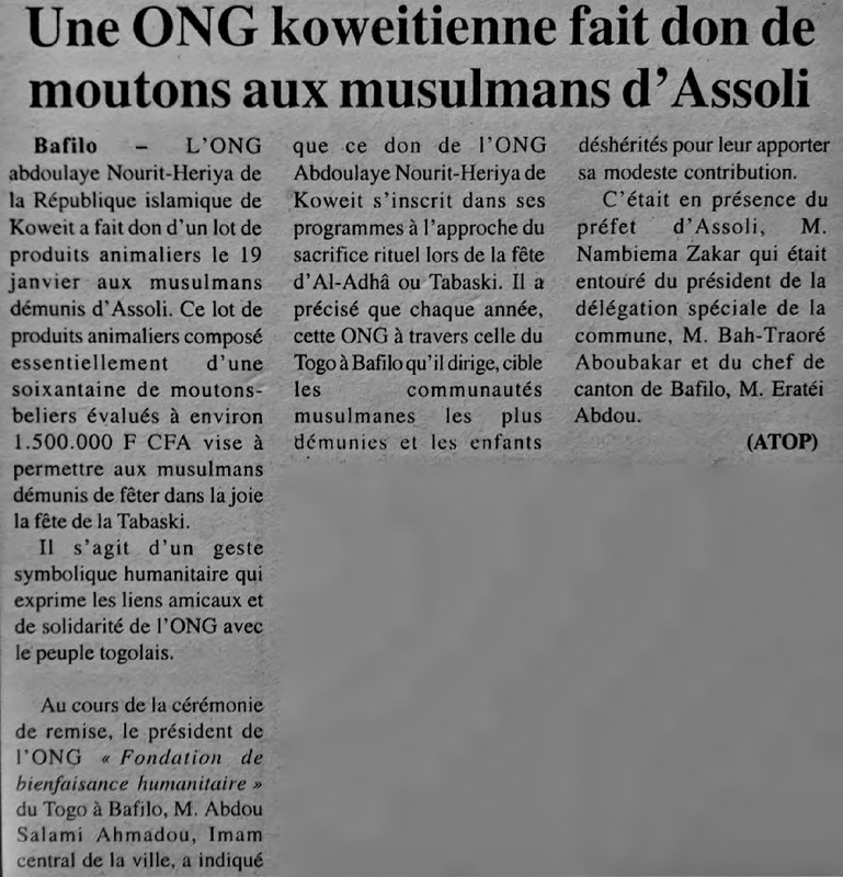 Une ONG koweitienne fait don de moutons aux musulmans d'Assoli