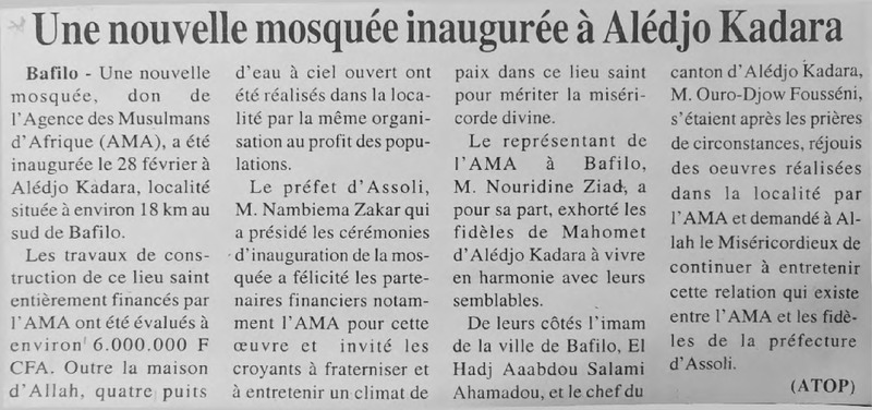 Une nouvelle mosquée inaugurée à Alédjo Kadara