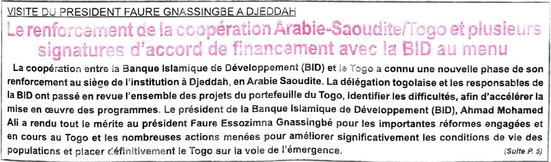 Visite du président Faure Gnassingbé à Djeddah : le renforcement de la coopération Arabie-Saoudite/Togo et plusieurs signatures d'accord de financement avec la BID au menu