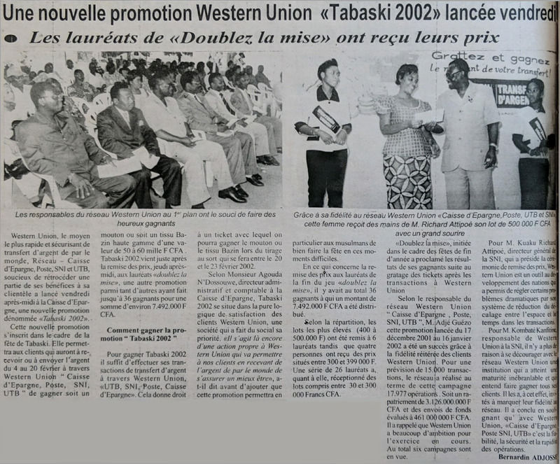 Une nouvelle promotion Western Union "Tabaski 2002" lancée vendredi : les lauréats de "Doublez la mise" ont reçu leurs prix