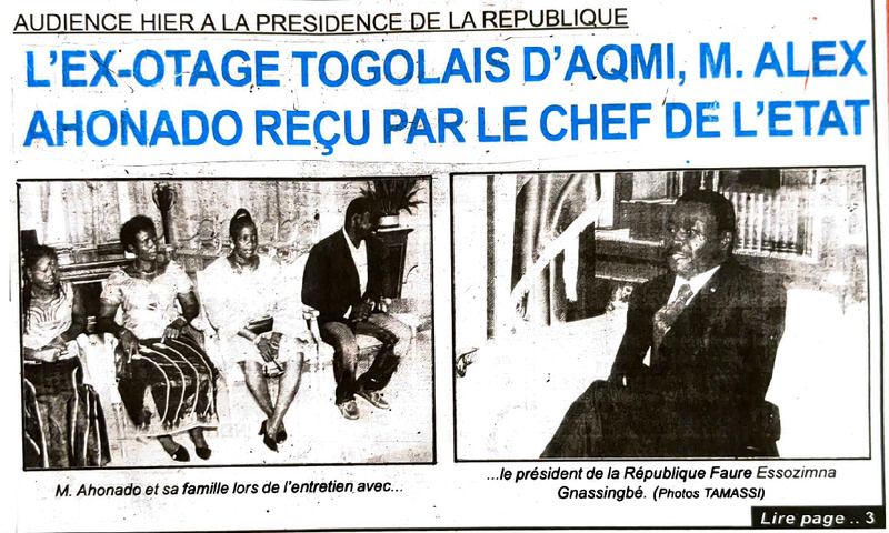 Audience hier à la présidence de la République : l'ex-otage togolais d'AQMI, M. Alex Ahonado reçu par le chef de l'Etat