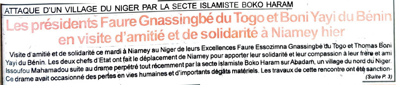 Attaque d'un village du Niger par la secte islamiste Boko Haram : les présidents Faure Gnassingbé du Togo et Boni Yayi du Bénin en visite d'amitié et de solidarité à Niamey hier