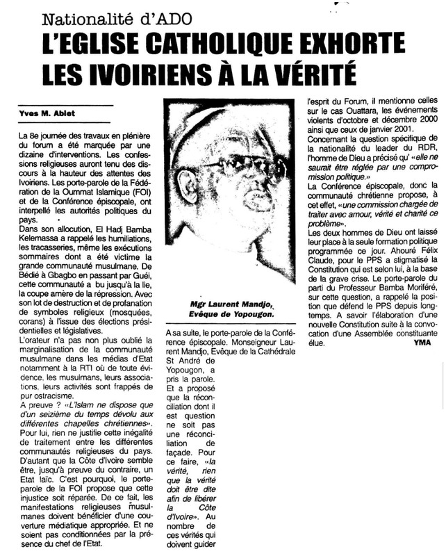 Nationalité d'ADO : l'Église catholique exhorte les Ivoiriens à la vérité