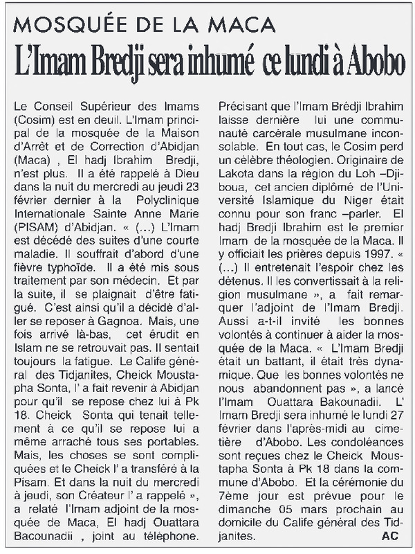 Mosquée de la MACA : l'Imam Bredji sera inhumé ce lundi à Abobo