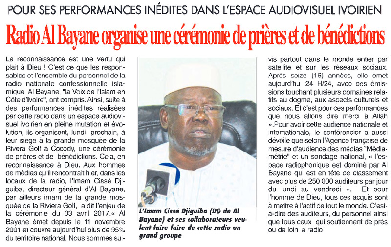 Pour ses performances inédites dans l'espace audiovisuel ivoirien : Radio Al Bayane organise une cérémonie de prières et de bénédictions