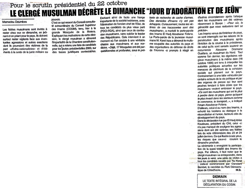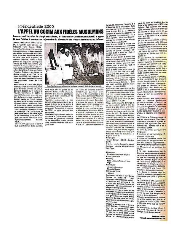 Présidentielle 2000 : l'appel du COSIM aux fidèles musulmans