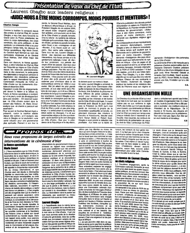 Présentation de vœux au chef de l'État. Laurent Gbagbo aux leaders religieux : "Aidez-nous à être moins corrompus, moins pourris et menteurs!"