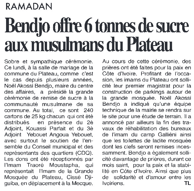 Ramadan : Bendjo offre 6 tonnes de sucre aux musulmans du Plateau