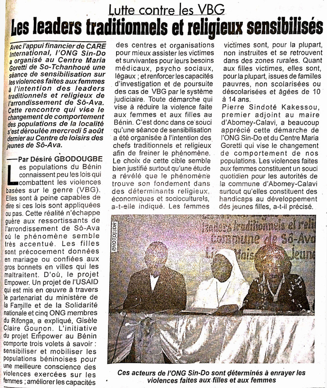 Lutte contre les VBG : les leaders traditionnels et religieux sensibilisés