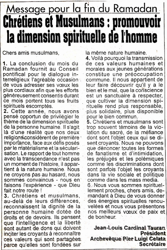 Message pour la fin du Ramadan. Chrétiens et Musulmans : promouvoir la dimension spirituelle de l'homme