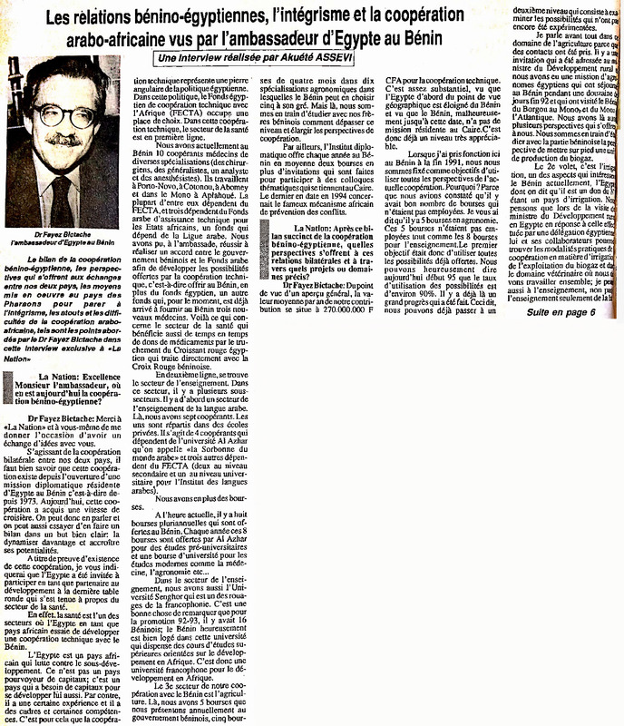 Les relations bénino-égyptiennes, l'intégrisme et la coopération arabo-africaine vus par l'ambassadeur d'Egypte au Bénin