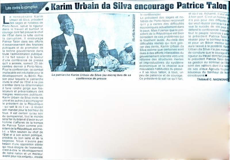 Lutte contre la corruption : Karim Urbain da Silva encourage Patrice Talon
