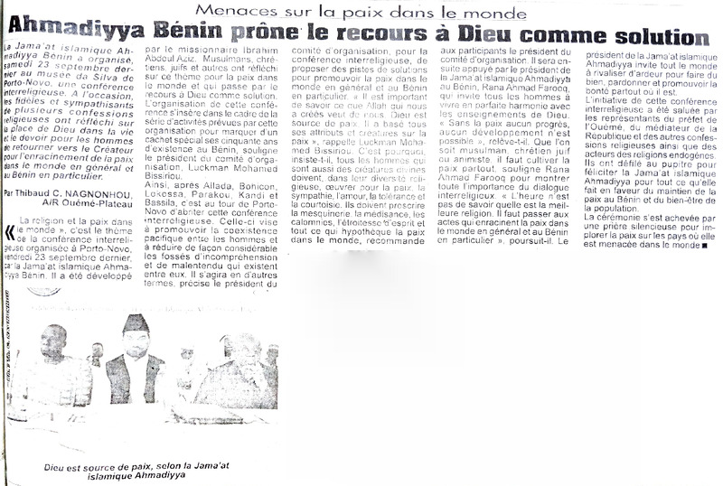 Menaces sur la paix dans le monde : Ahmadiyya Bénin prône le recours à Dieu comme solution