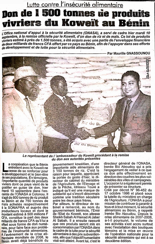 Lutte contre l'insécurité alimentaire : don de 1 500 tonnes de produits vivriers du Koweït au Bénin