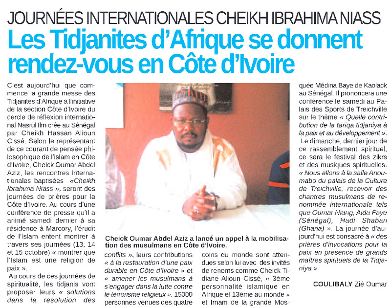 Journées internationales Cheikh Ibrahima Niass : les Tidjanites d’Afrique se donnent rendez-vous en Côte d’Ivoire