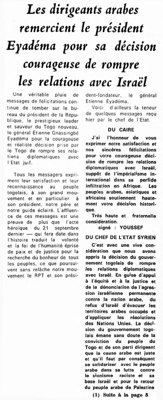 Les dirigeants arabes remercient le président Eyadéma pour sa décision courageuse de rompre les relations avec Israël