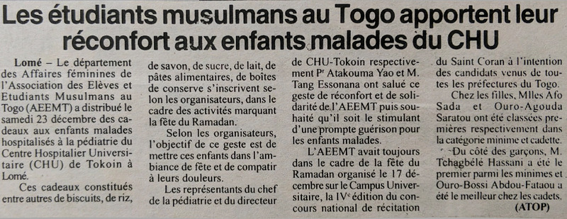 Les étudiants musulmans au Togo apportent leur réconfort aux enfants malades du CHU