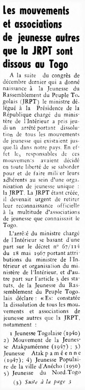 Les mouvements et associations de jeunesse autres que la JRPT sont dissous au Togo
