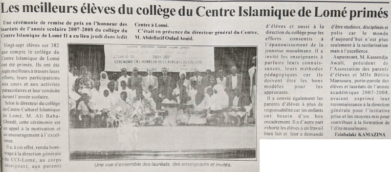Les meilleurs élèves du collège du Centre Islamique de Lomé primés