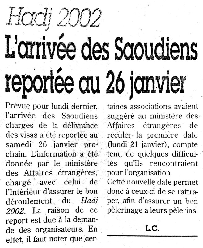 Hadj 2002 : l'arrivée des Saoudiens reportée au 26 janvier